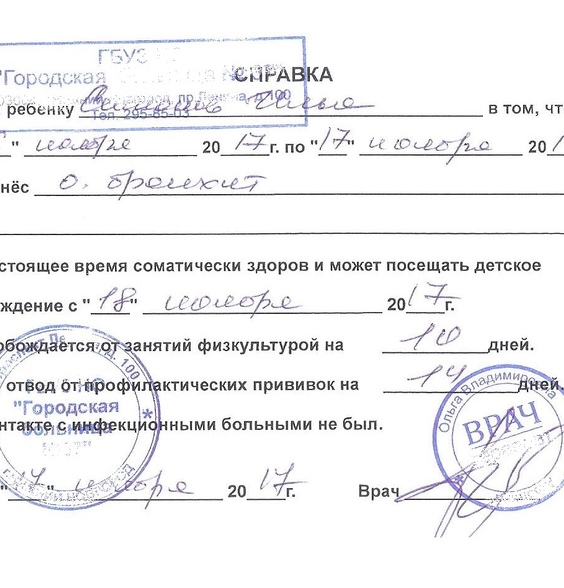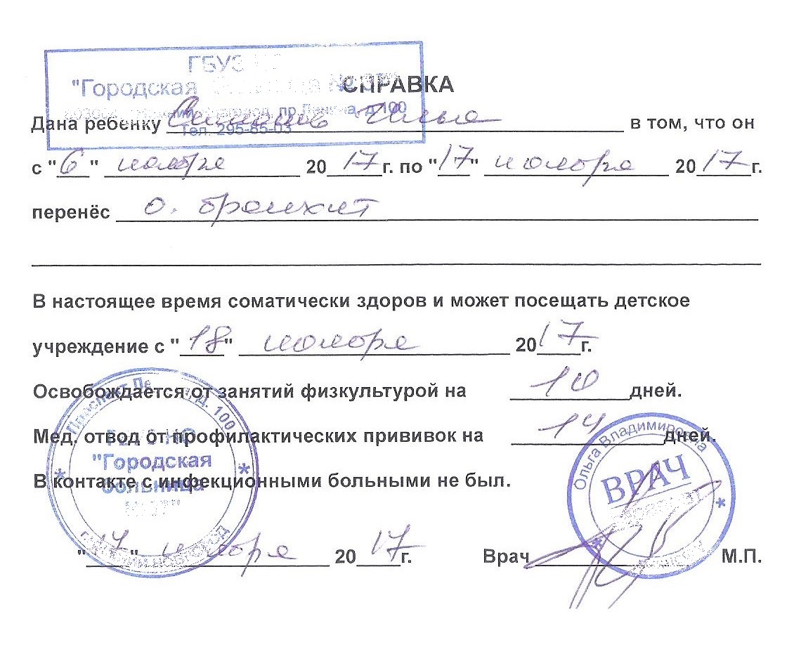 При идеальном раскладе следует обратиться в поликлинику сразу же, как проявились симптомы слабости у малыша. Таким образом можно гораздо быстрее и правильнее назначить медикаментозное лечение и пропустить меньше занятий в садики. После выздоровления (в указанные педиатром числа) необходимо повторно прийти к специалисту для финального осмотра, после чего будет выдана необходимая справка. Уже с этим документом можно идти в садик и предоставлять ее воспитателю.