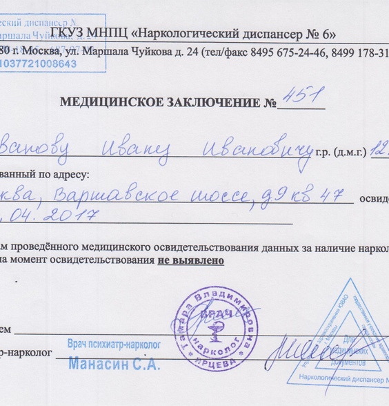 Наша организация занимается изготовлением любых медицинских документов. Если вам требуется купить медсправку нарколога и психиатра, то мы готовы помочь. Вам не придется выходить из дома или сдавать какие-то анализы, достаточно связаться с нами и купить справку для ГИБДД с наркологом. Сегодня мы обработаем вашу заявку, а уже на следующий день курьер доставит к вам готовый документ. Оплата производится только после получения справки на руки.